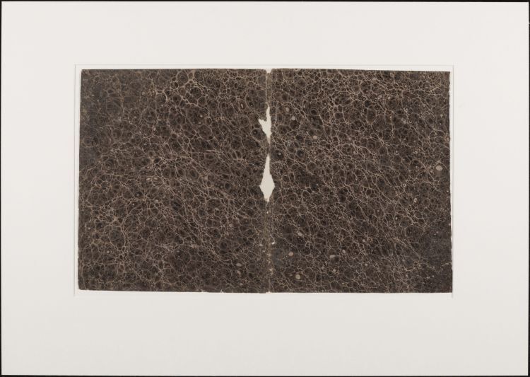 Blad met marmer in klein Turks patroon, in bruin, oud boekomslag