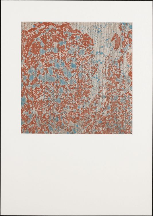 Blad met marmer in spatwerktechniek, in grijs, rood en blauw