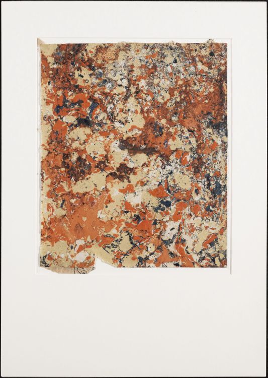 Blad, geel geverfd, met marmer, vermoedelijk oliemarmering, in oranje, blauw en wit