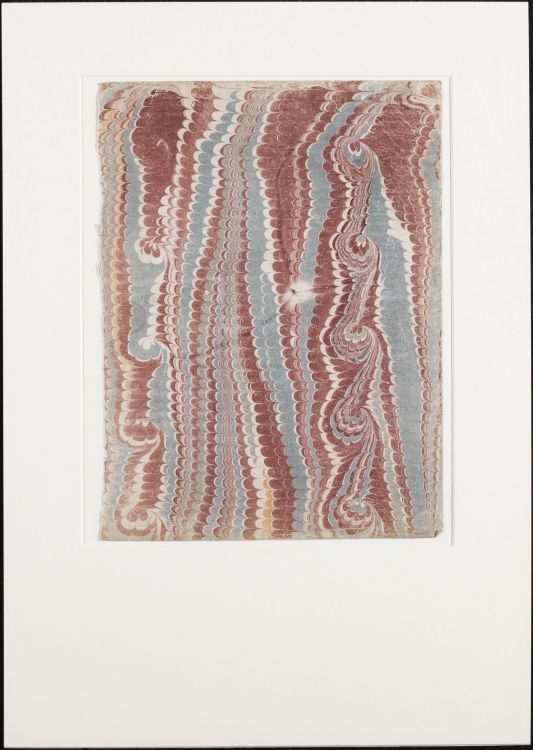 Blad met marmer in kamwerktechniek, in Duits patroon, in rood, blauw, groen en geel, vermoedelijk oud boekomslag