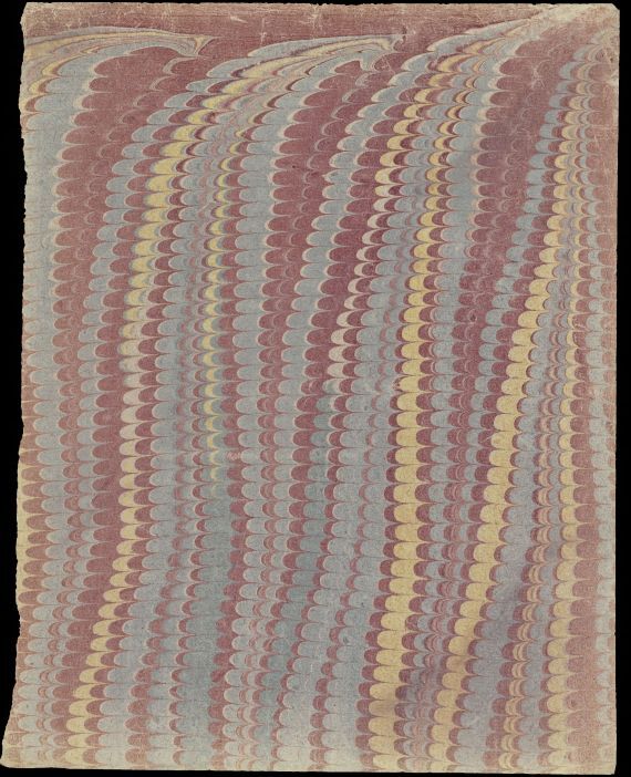 Blad met marmer in krulwerktechniek, in Hollands patroon, in rood, blauw en geel, vermoedelijk oud boekomslag