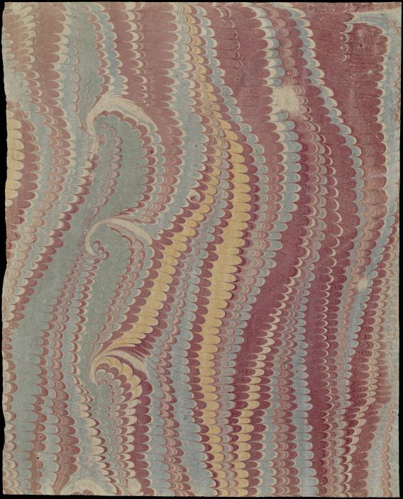 Blad met marmer in krulwerktechniek, in Hollands patroon, in rood, blauw, groen en geel, vermoedelijk oud boekomslag
