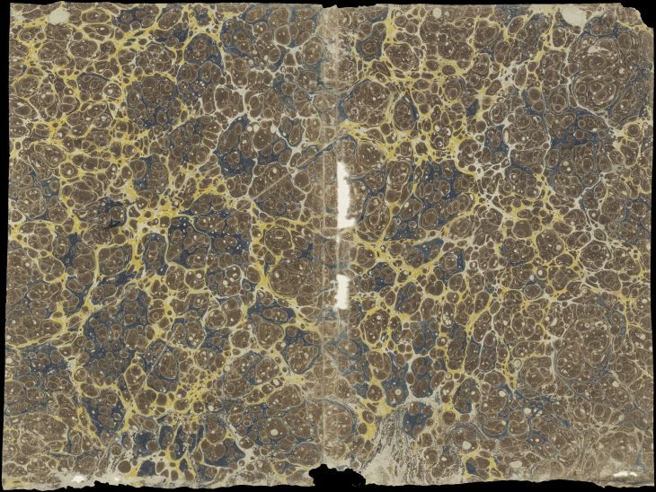 Blad met marmer in schelppatroon, in bruin, geel en blauw, oud boekomslag