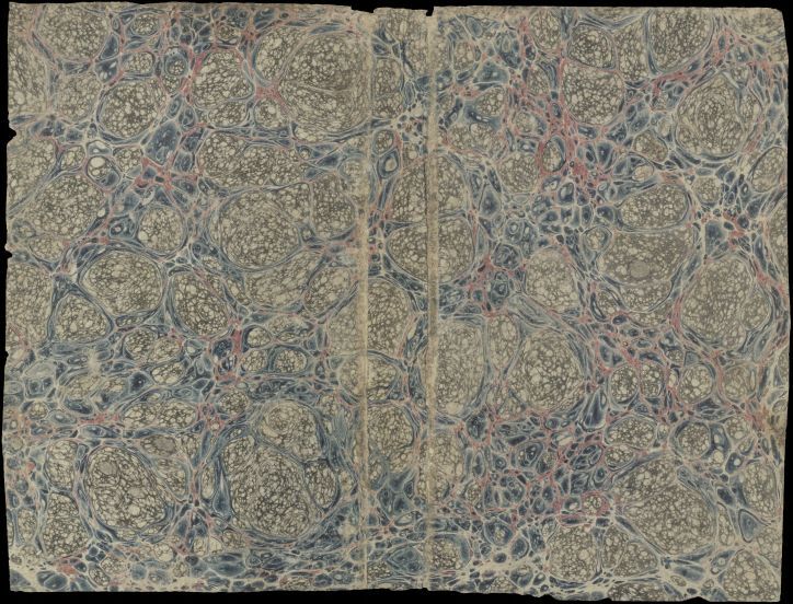 Blad met marmer in schelppatroon, in grijs, blauw en rood, oud boekomslag
