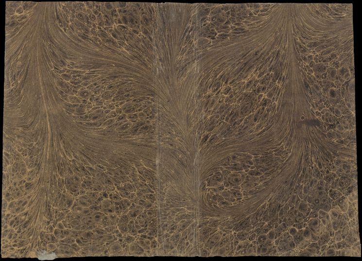 Blad met marmer in kamwerktechniek, in schelppatroon, in bruin, oud boekomslag