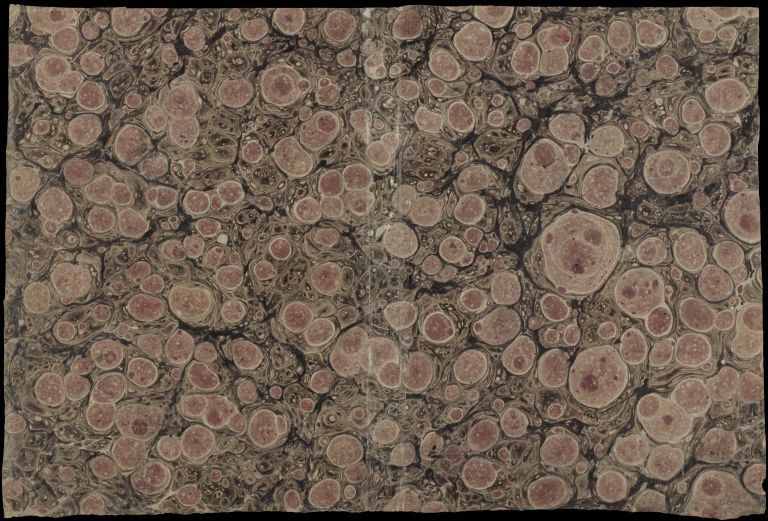 Blad met marmer in groot schelppatroon, in rood en bruin, oud boekomslag