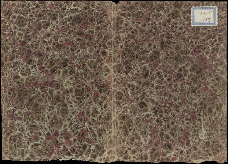 Blad met marmer in klein schelppatroon, in bruin en rood, oud boekomslag