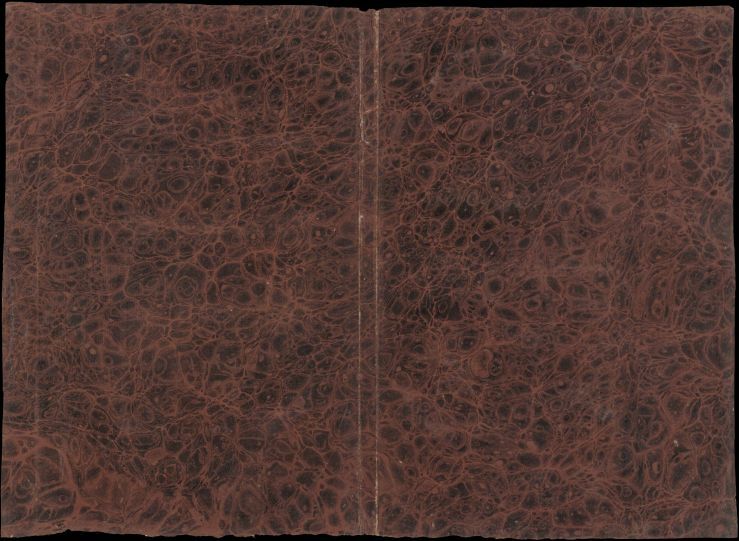 Blad met marmer in klein schelppatroon, in zwart en bruin, oud boekomslag