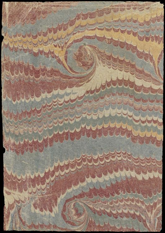 Blad met marmer in spiraalkamwerktechniek, in rood, blauw, geel en groen, oud boekomslag