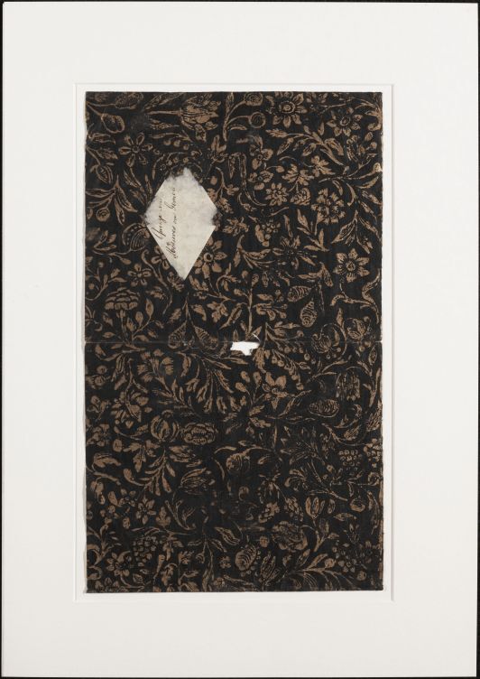 Blad zwart geverfd bronsvernispapier met bloemmotieven, oud boekomslag