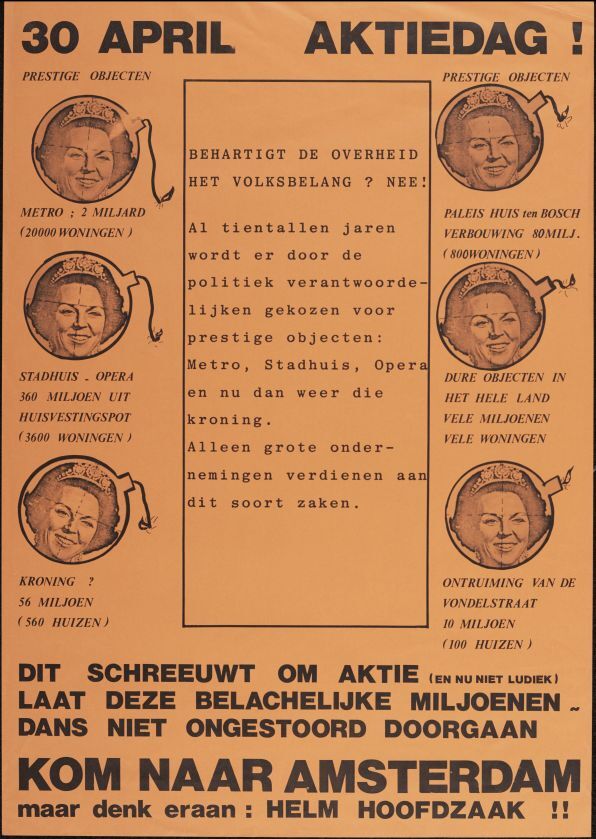 Affiche met oproep tot aktiedag voor woningen in plaats van de kroning van Beatrix