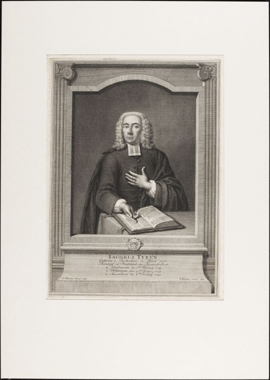 Portret van Jacobus Tijken staande aan tafel met opgeslagen bijbel