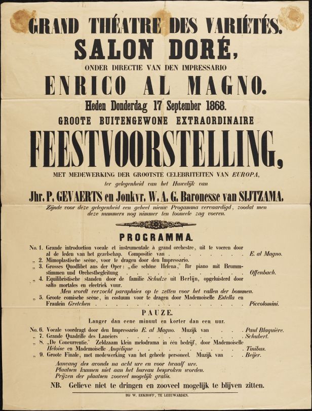 Affiche voor de feestvoorstelling ter gelegenheid van het huwelijk van Jhr. P. Gevaerts en Jvr. W.A.G. Baronesse van Sijtzama door het Grand Théatre des Variétés, Salon Doré, te Leeuwarden op 17 september 1868