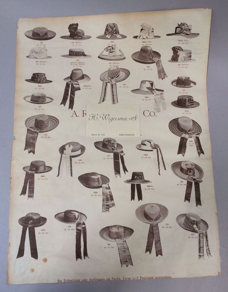 55 stuks divers pakpapier, zakjes en een reclameposter met voorbeelden van hoeden H.G. Wigersma S. Nauw E. 180 Leeuwarden