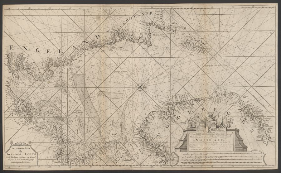 Nieuwe curieuse verbeeterde gelijk graadige paskaart van de geheele Noord Zee