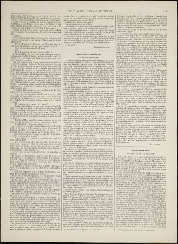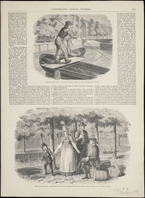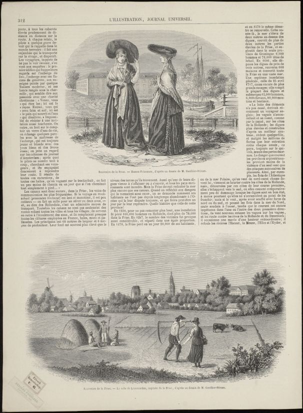 Blad met tekst en drie houtgravures met klederdrachten en een met gezicht op Leeuwarden