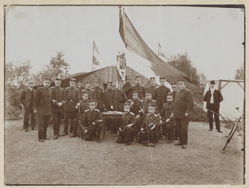 Groepsfoto van de Schutterij te Leeuwarden met namenlijst en nummering van de personen en achterop de foto een krantenknipsel uit 1934