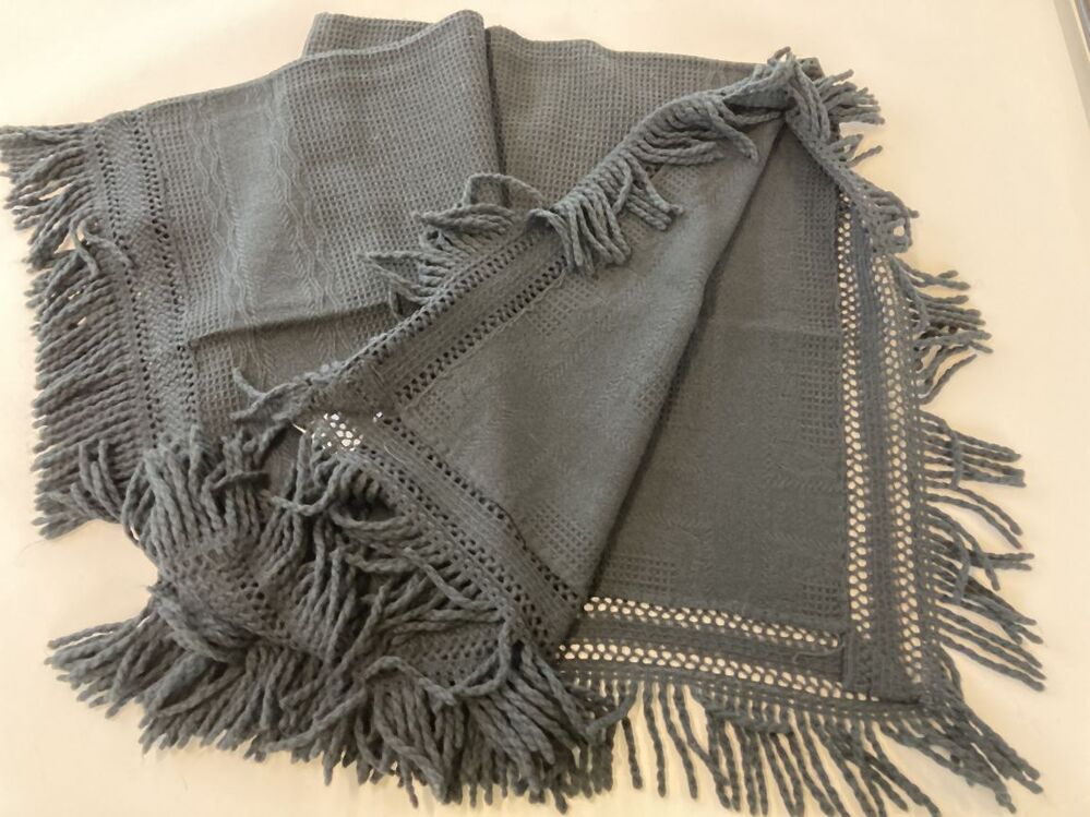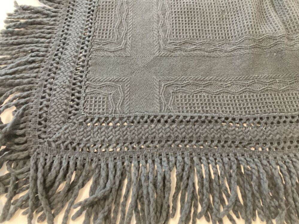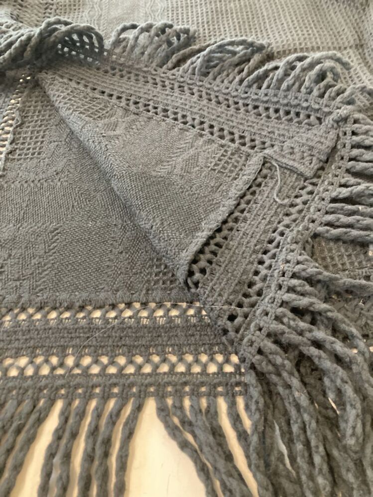 Zwart wollen omslagdoek in wafelbinding met rondom ingeweven rand, met franje