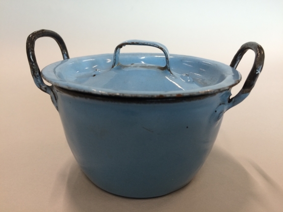 Blauw-witte pan met zwarte handgrepen en blauwe deksel