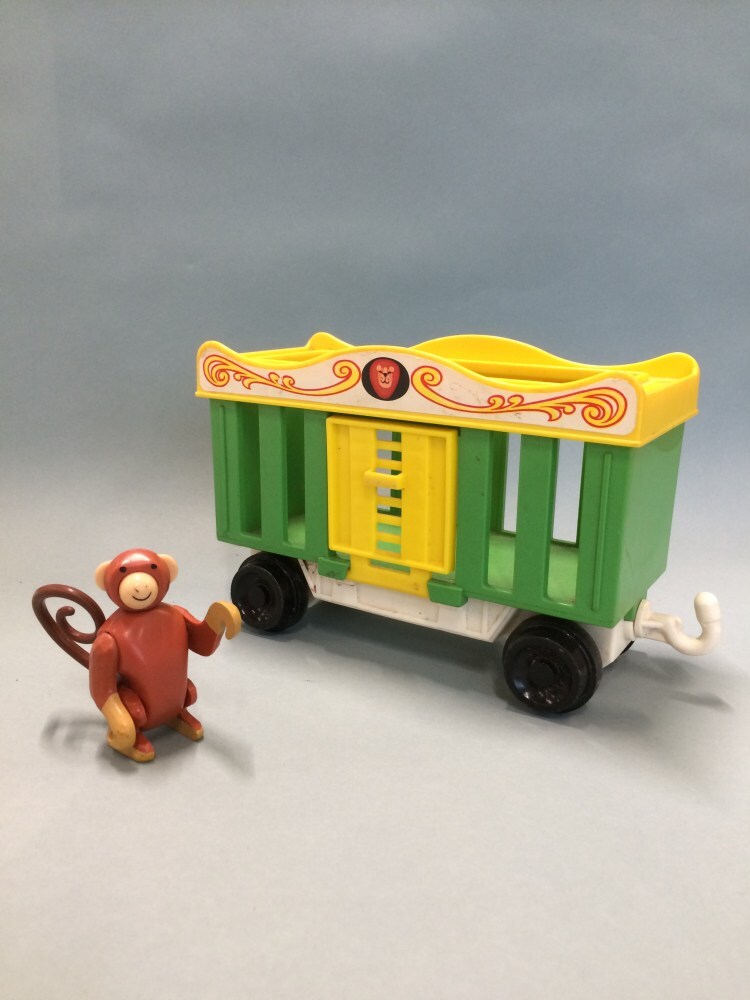Speelgoedauto Circus Train voorstellende groen met gele leeuwenwagen met aap