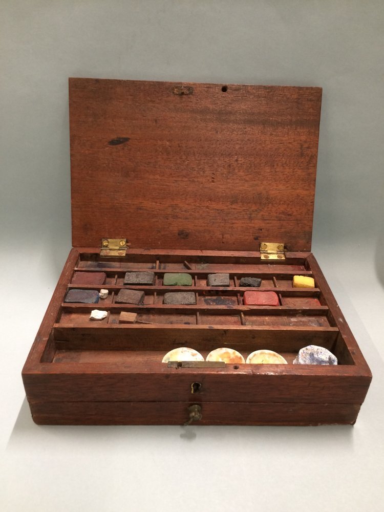 Verfdoos met blokjes verf, houten kistje met extra laadje