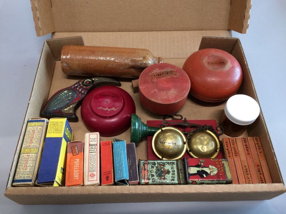 Winkelspullen met weegschaal en gewichtjes met diverse blikjes en kartonnen doosjes