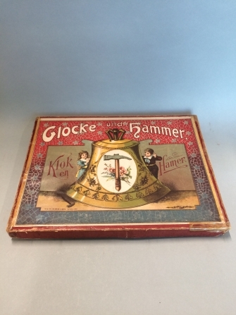Doos met kartonnen kaarten, houten blokjes met symbolen en houten hamertje, klok en hamerspel