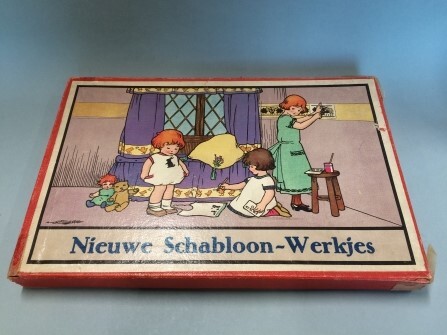 Doos met napjes verf en kartonnen sjablonen