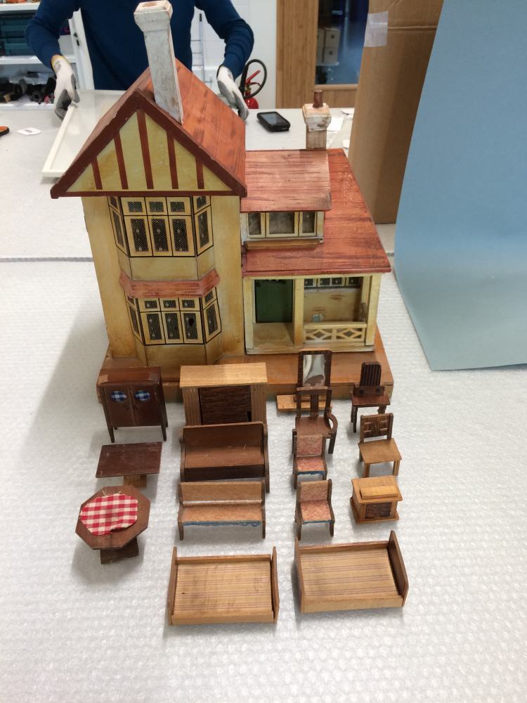 Poppenhuisje met twee verdiepingen, erker, uitbouw met veranda en triplex meubels