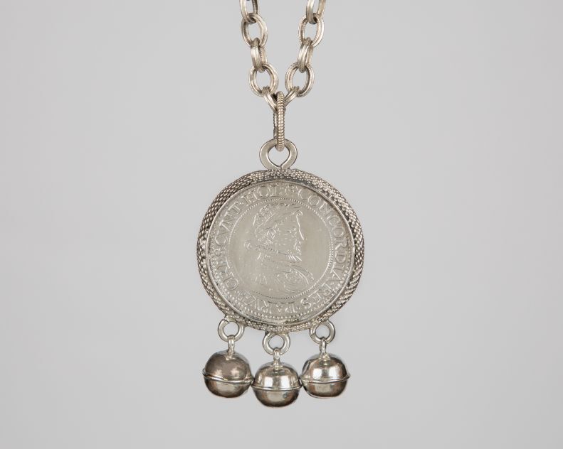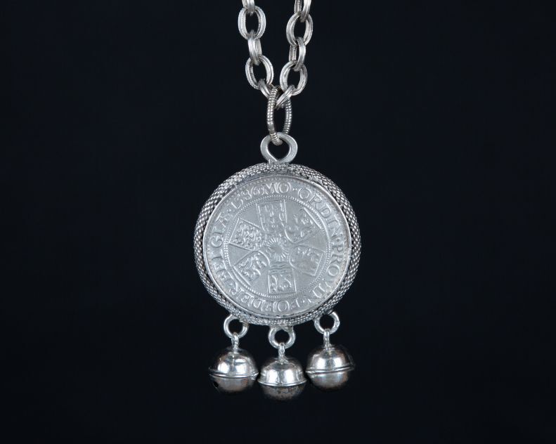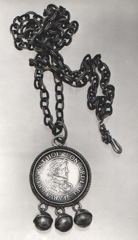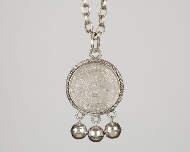 Rinkelbel van gegoten rijksdaalder met borstbeeld van Leicester met lauwerkrans