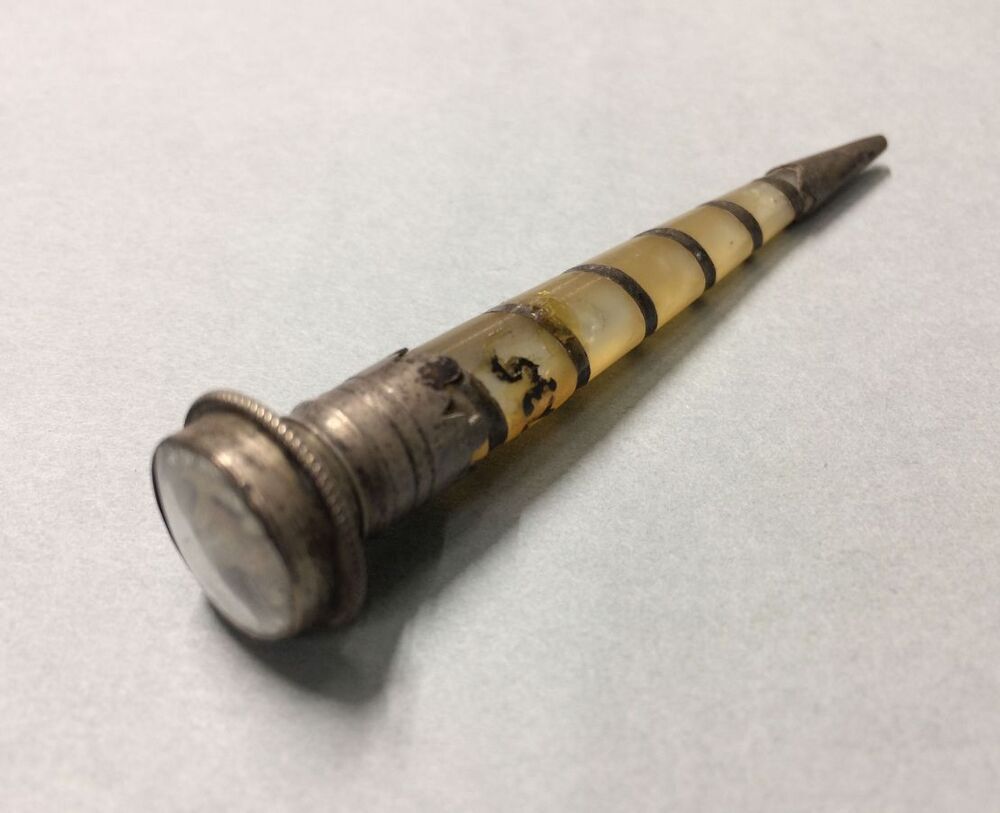 Pijpenpluizer met op de top, achter glas, een keeshondje van zilver