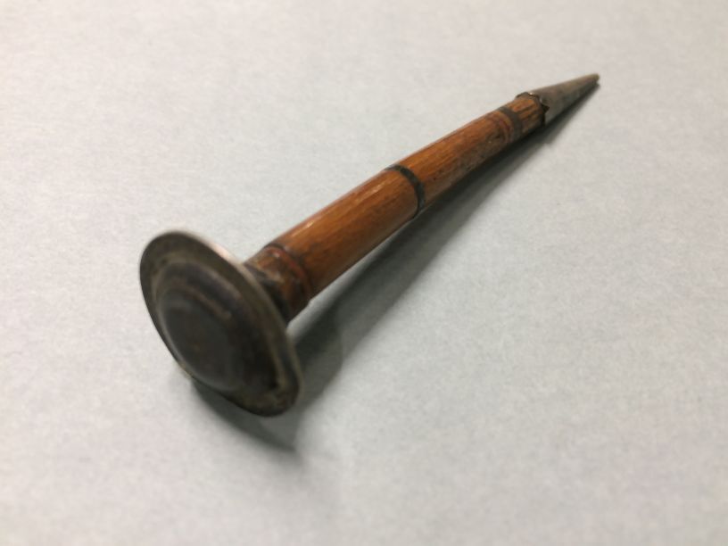 Pijpenpluizer met een platte, ronde kop, waarop een tweede, bolle kop geappliqueerd is met een afgeplat bovenvlak
