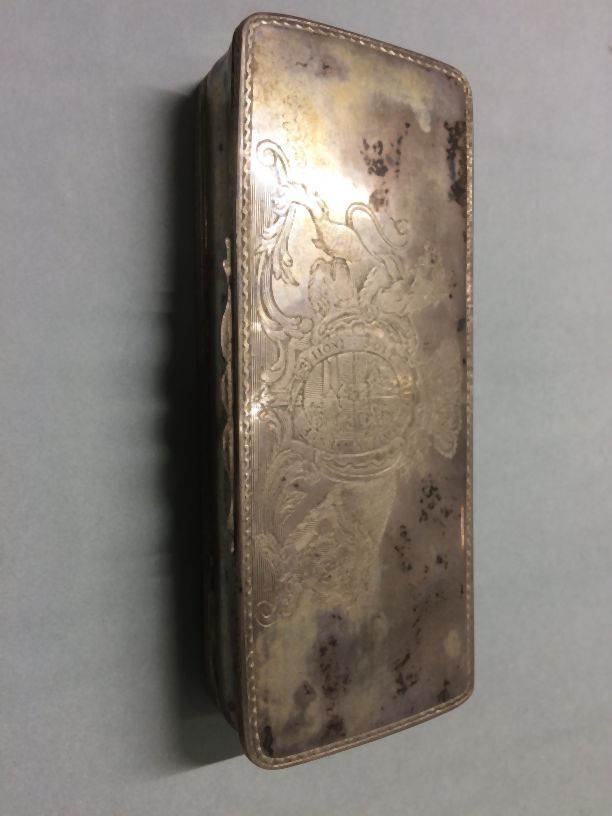 Tabaksdoos met wapen op deksel tussen twee leeuwen
