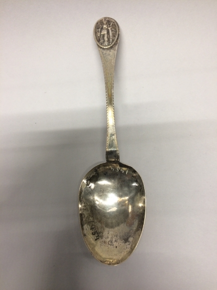 Lepel met medaillon in steel waarop vrouwenfiguur leunend op een zuil
