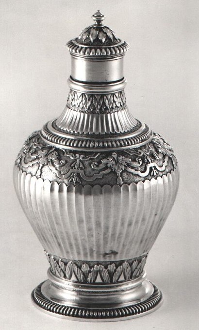 Theebus met op de welving van het vat, rond de aanzet van de voet, een krans van palmetten op gegranuleerde grond