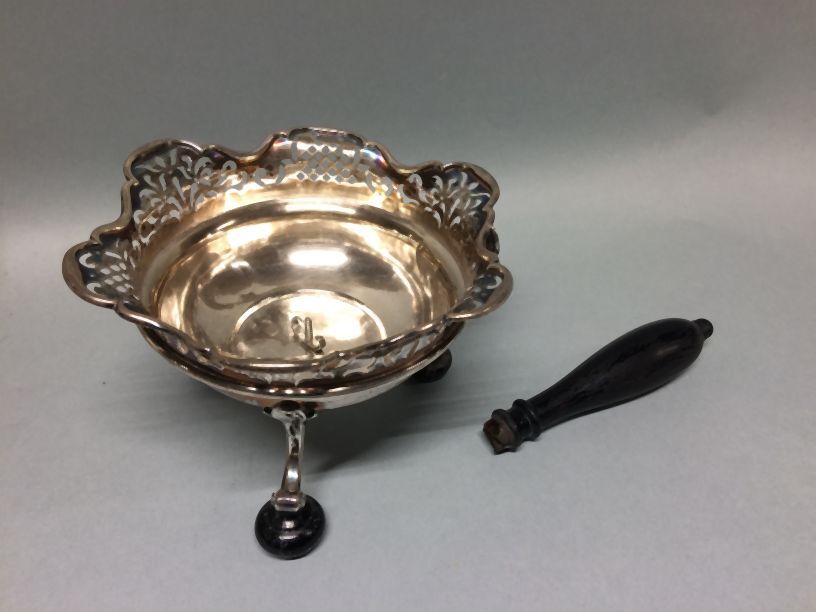 Komfoor met zwart gelakt houten handvat met zilveren, cylindrische aanzet op de hol-spreidende wand