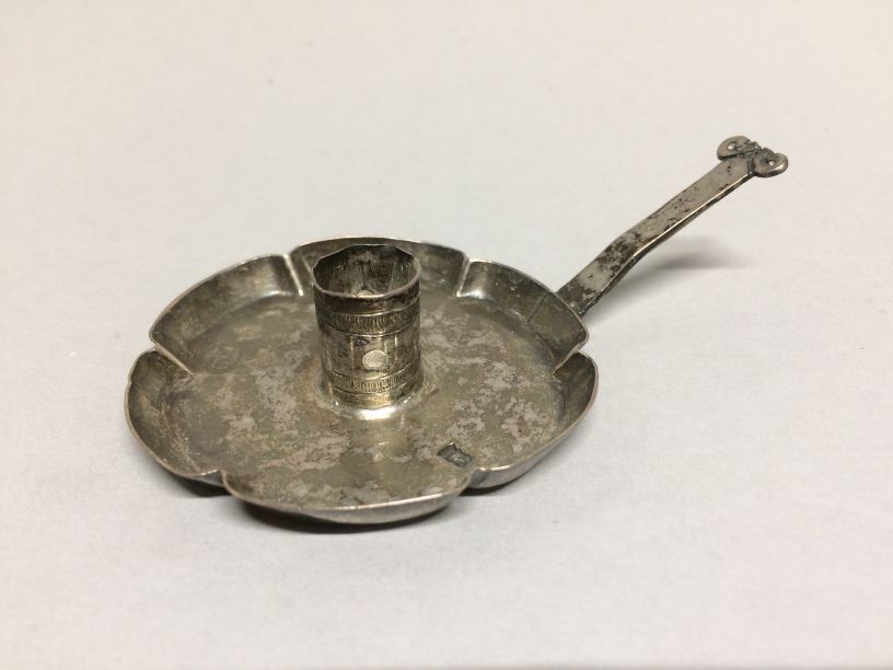 Lage kandelaar met een schotel- of schaalvormige voet die veelal is voorzien van een oortje als handvat. Werd ook kaarsepan genoemd. Soms (zonder oortje) bevestigd op kerkgestoelte. RT armluchter. https://data.cultureelerfgoed.nl/term/id/cht/68e8cc2b-9b95-4e08-acc2-b8e72e066e72