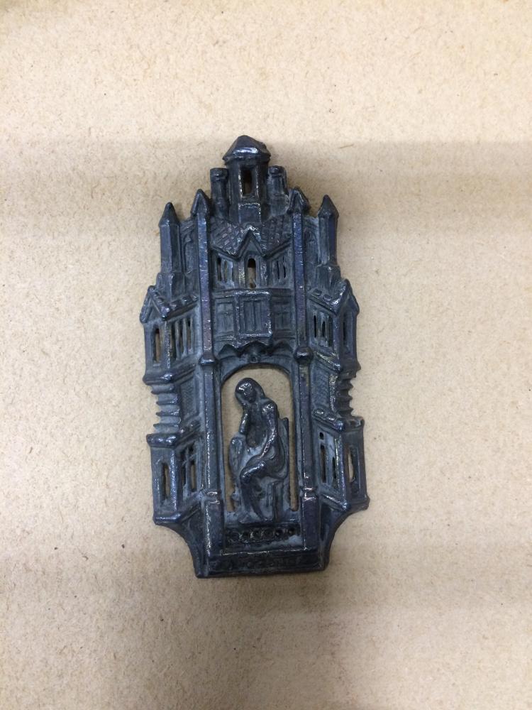Ajour beslag van verguld zilver, voorstellend een man of een vrouw, op een stoel zittend in de poort van een gebouw in gothische stijl.