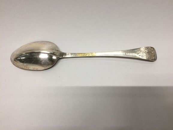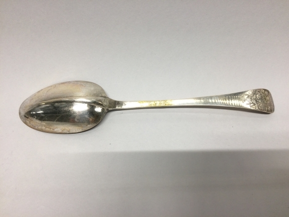 Lepel met achterop de steel een rond wapen gegraveerd gedekt door een kroon van zeven parels