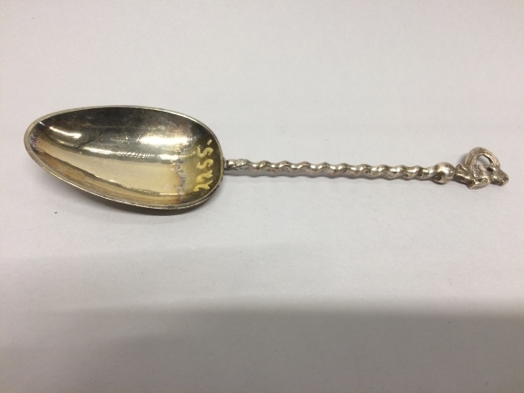 Lepel met als bekroning een vrouw, staand op een bol, terwijl ze een door de wind bol geblazen sluier vasthoudt