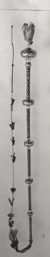 Houten stok, naar boven toe verjongend, bekleed met bruin fluweel, versierd met àjour zilverbeslag, onder aan een bolle nodus met een holverjongend bovenstuk, waarop weer een kleine bolle nodus