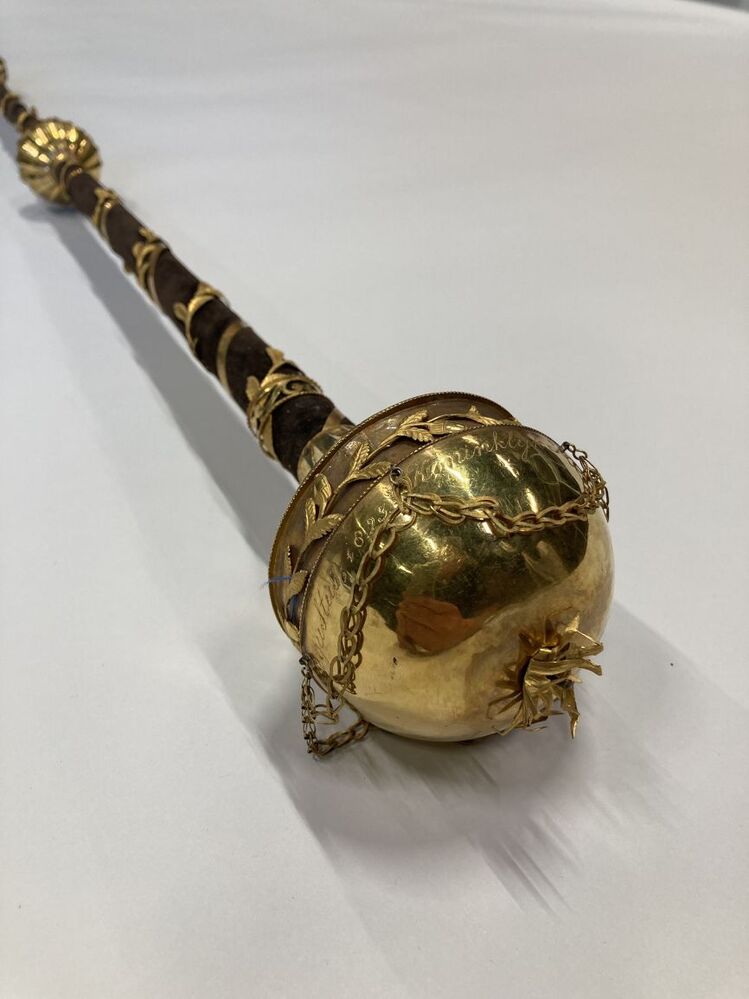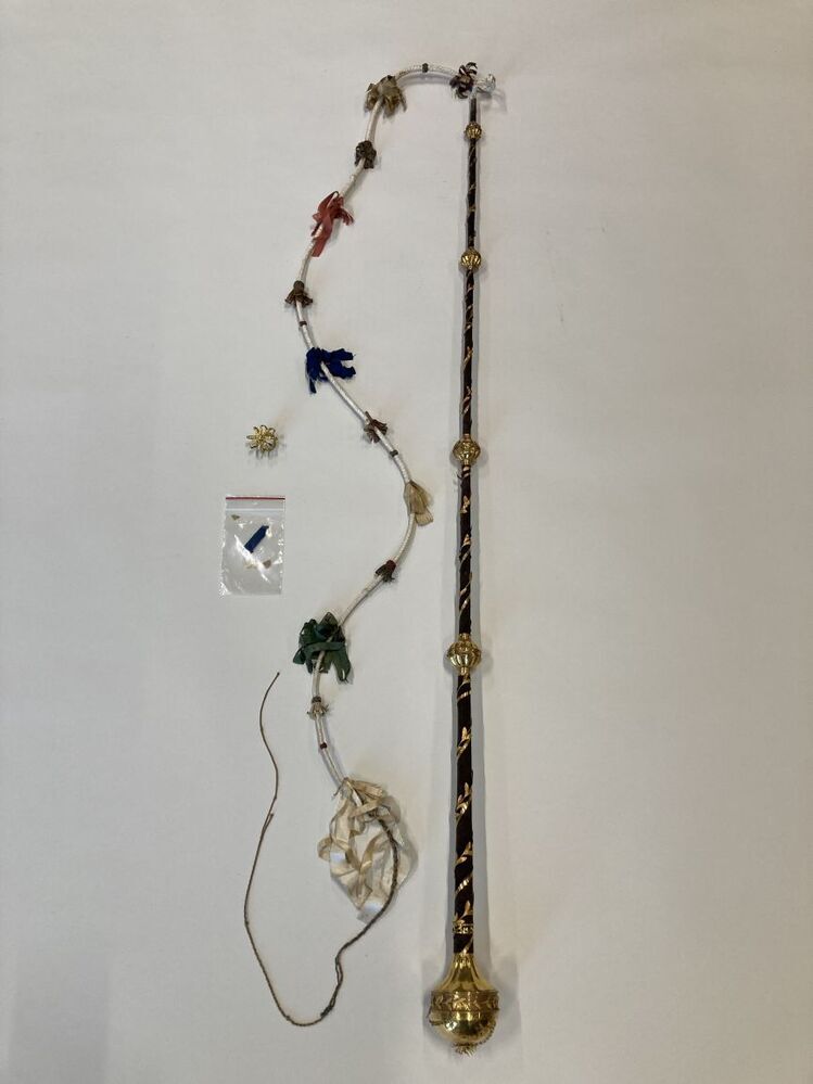 Houten stok, naar boven toe verjongend, bekleed met bruin-zwart fluweel, versierd met àjour zilverbeslag, onderaan een zeskantige, met een bol onderstuk en een hol-verjongend bovenstuk