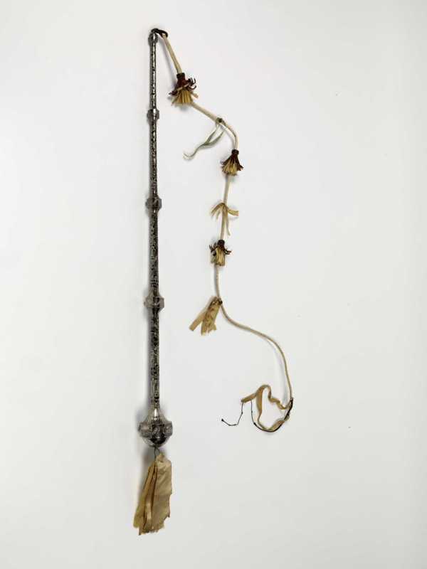 Houten stok, naar boven toe verjongend, bekleed met bruin fluweel, versierd met àjour zilverbeslag, onderaan een nodus, met bolspreidend onderstuk, cylindrisch middenstuk en rechtverjongend bovenstuk