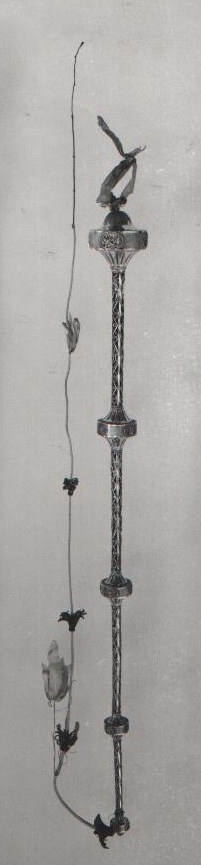 Houten stok, naar boven toe verjongend, bekleed met bruin fluweel, onderaan een nodus met een S-vormig spreidend onderstuk, een cylindrisch middenstuk en een hol verjongend bovenstuk