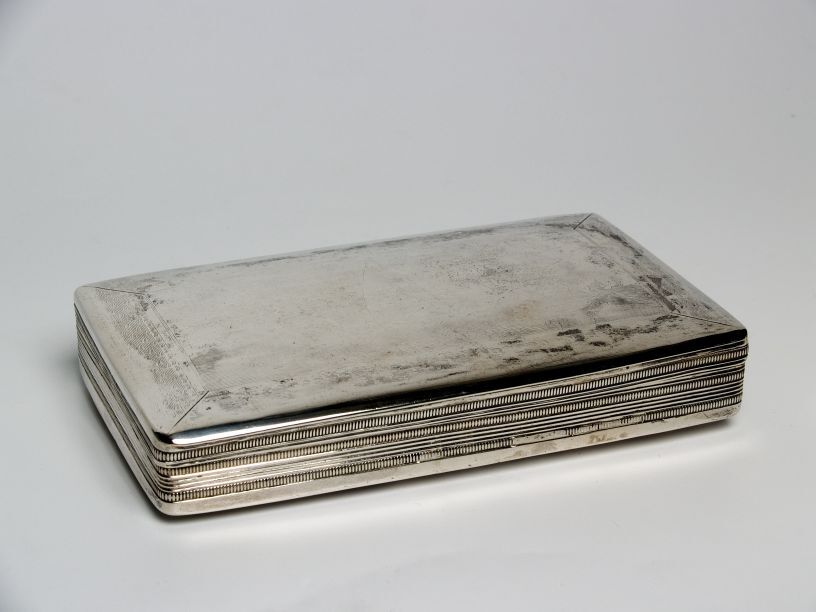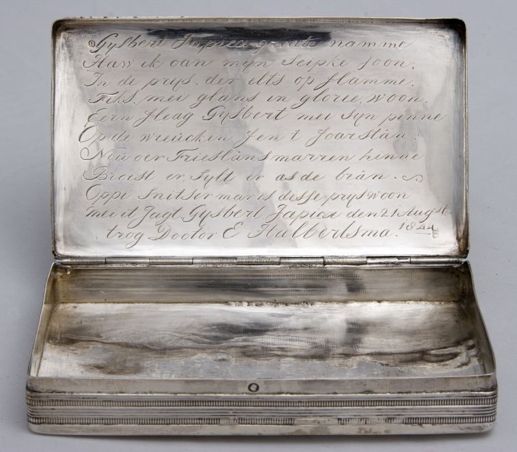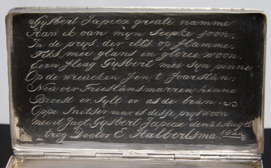 Zeilprijs van dr. Eeltje Halbertsma, tabaksdoos met op het deksel landschap met een zeilend schip