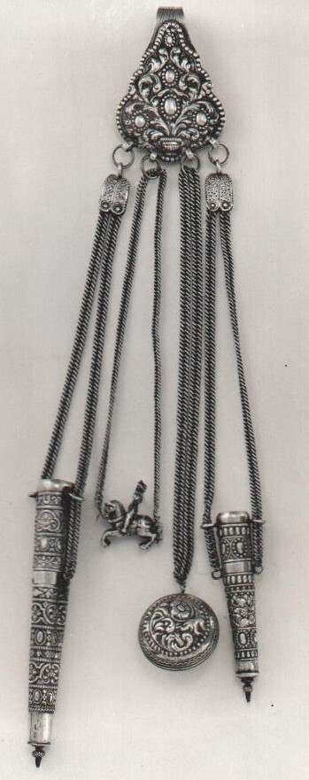 Chatelaine of prak met peervormige haak met 4 platte kettingen waaraan naaldenkoker, reukdoosje, ruitertje en vork in schede