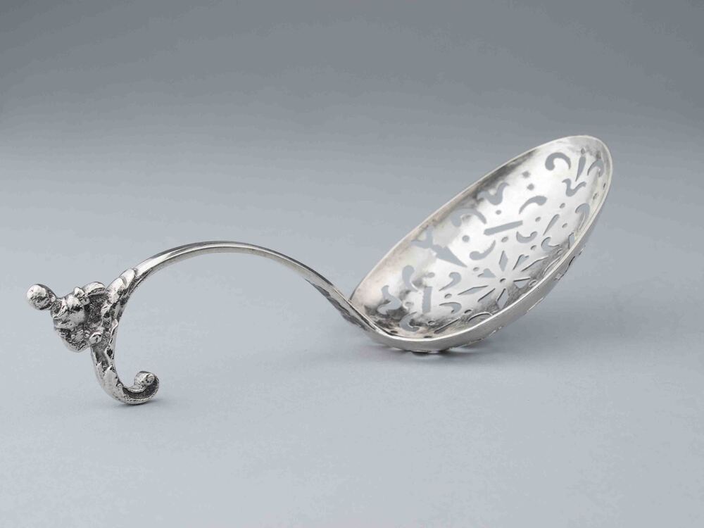 Suikerstrooier met bovenop de krul van de steel een vrouwenfiguurtje ten halve lijve, onder de linkerarm een rommelpot houdend