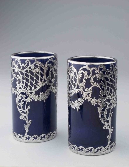 Een van twee cylindrische, blauwglazen vaasjes, waarvan de opstaande wanden versierd zijn met ajour zilveren ornament