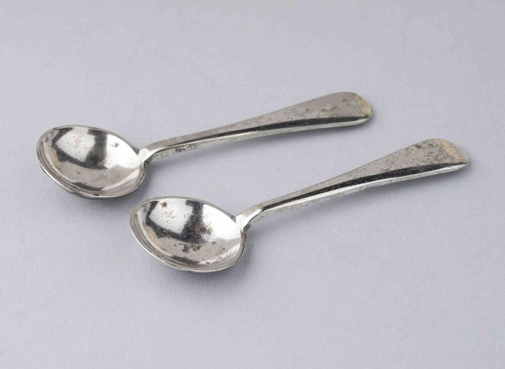 Twee zoutlepeltjes met een rond blad en een rechte steel, naar boven toe breder wordend en rond afgewerkt
