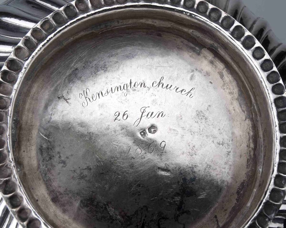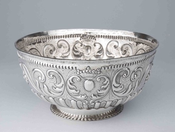 Kom waarop ovale medaillons, gedekt door een kroon van acht parels